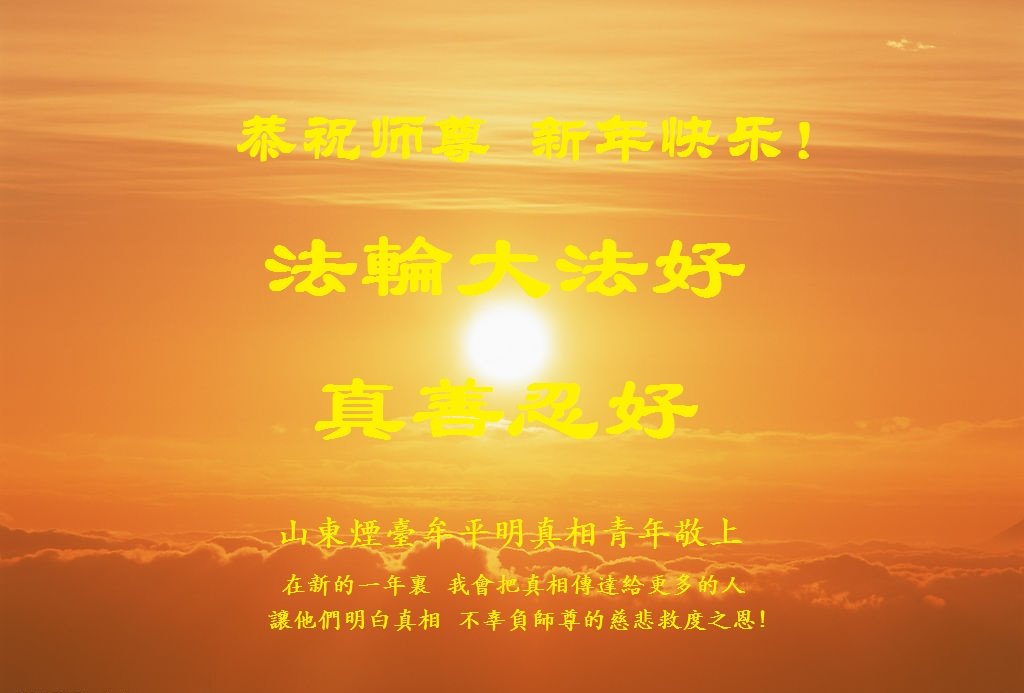 青岛东部的一资料点的大法弟子恭祝师父新年快乐!他们说:“我们把满怀对慈悲伟大的师父的思念和感恩之心凝成一句话:学好法,修好心,不懈怠,多救人,路走正,证实法,报师恩!”