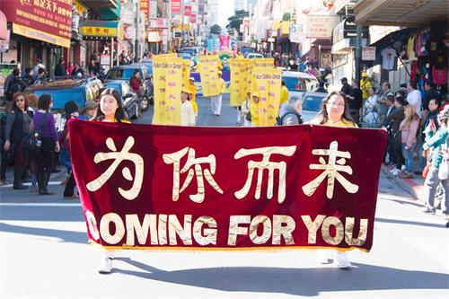 【明慧网二零一八年二月十八日】(明慧记者贾维、王英旧金山报道)二零一八年二月十七日是大年初二,美国旧金山湾区的法轮功学员在旧金山市中心和中国城举行游行,欢庆中国新年,展现中国传统文化,给旧金山民众拜年、送祝福。