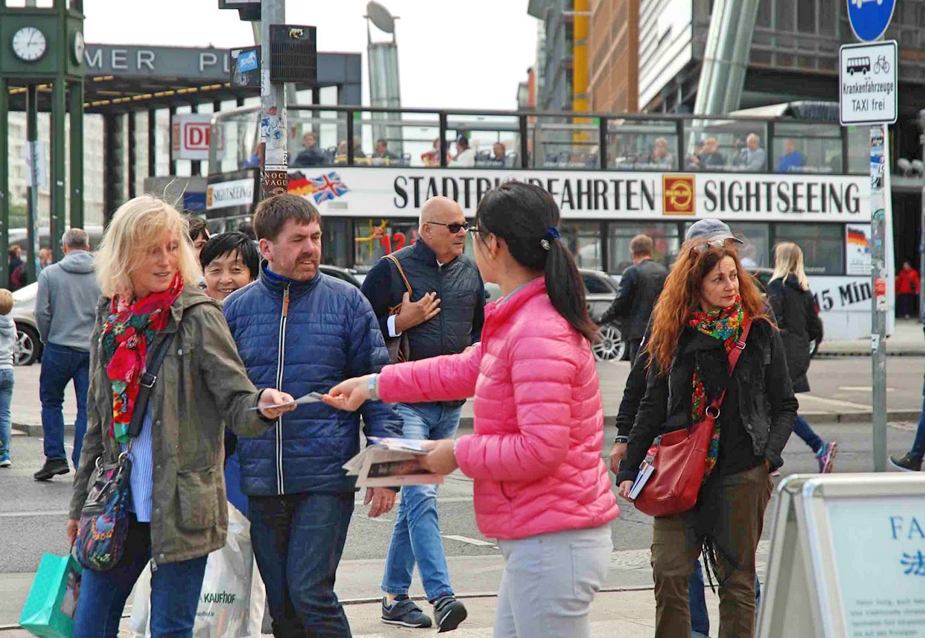 图1~3:六月二十三日法轮功学员在柏林波兹坦广场( Potsdamer Platz) 上向游客讲真相