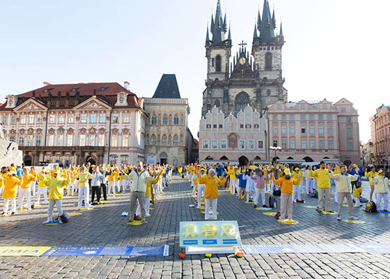 九月二十八日上午,来自欧洲各国的一千五百多名法轮功学员聚集在捷克布拉格的老城区广场,进行了集体炼功、讲真相和征集签名反迫害的活动。