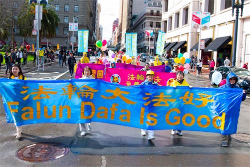 中午十二点,由旧金山法轮大法修炼者和支持者组成的游行队伍冒雨从旧金渡轮大厦前的广场出发。走在最前面的是美西法轮大法天国乐团,紧接在后的舞龙队、小花船和仙女队。第二方阵是法轮大法好,由车旗队、横幅队、炼功队、花车和各民族队伍组成。第三方阵是明白真相得福报。第四方阵是三大媒体的队伍、气球队和腰鼓队组成。最后一个方阵是讲真相、九评退党队。