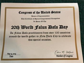 鉴于,我们很自豪地祝贺于二零一九年五月十六日至十八日举行的第二十届世界法轮大法日的庆祝活动;并且