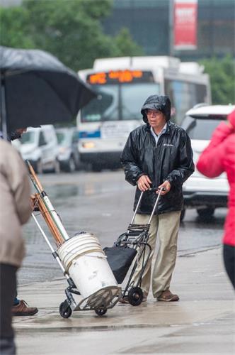 ![]() 图4:美中华人服务公司所在地(地址:135-25A 40RD,FL3,Flushing, NY 11354) | ![]() 图5:中领馆前助纣为虐的男子WAY H.QIU结束后推着小车离开。 |