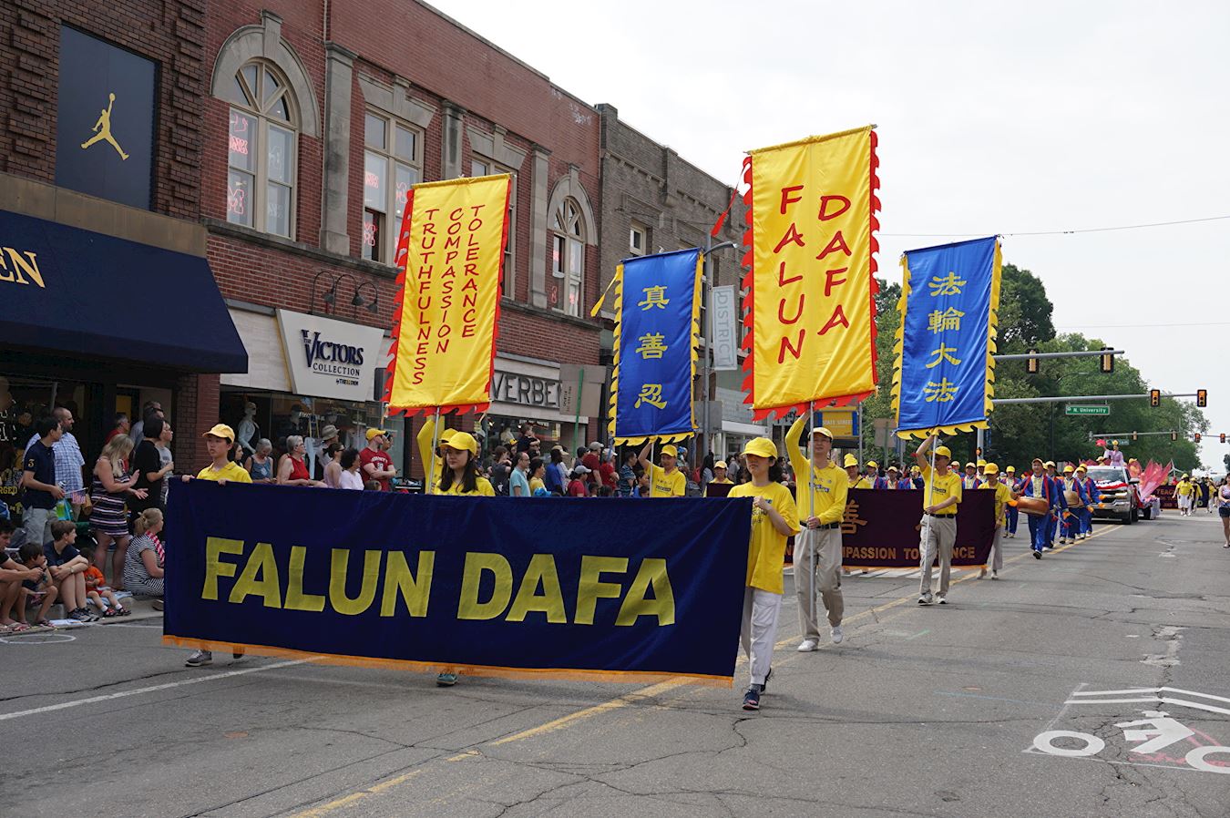 ![]() 图1~4:2019年7月4日,来自密西根州、俄亥俄州和加拿大温莎市的部份法轮功学员以花车和唐鼓队参加安娜堡国庆日游行,亮丽的色彩、平和的功法演示和学员们的精神面貌,让沿途的观众耳目一新 |