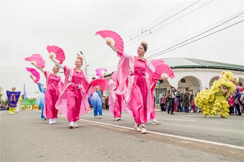 游行队伍到达苏萨宁(Susaninskaya)广场结束,所有的团队都参加了简短的展示,由特别评审团进行评估。法轮功学员摆出了一幅生动的画面,在中心,穿着中国传统服饰的女学员举起一块展板,上面写着“法轮大法好”,他们祝福所有的人在今天这个喜悦的日子里记住“真、善、忍”,并高举印有这三个字的展板,观众群中响起热烈的掌声。