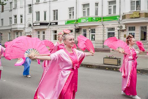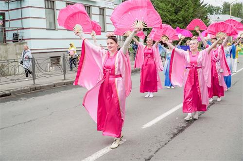 按当地传统,庆祝活动从上午的大游行开始,由各个创意团体、当地企业、教育和文化机构及学校参加。在各种各样的团队中,法轮功学员的方阵独具一格,给大家带来了东方文化气息。