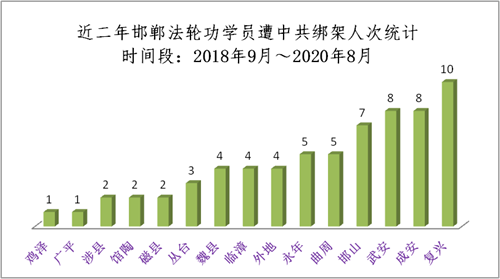二零一八年九月至二零二零年八月近两年,邯郸法轮功学员遭中共绑架的至少有六十九人次,从图表中我们看出,绑架人次最多的是复兴区,其次是成安、武安、邯山等,如下图。