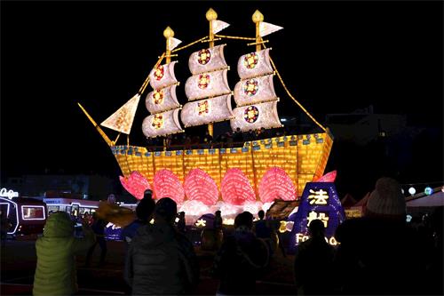 花费一年时间制作的全球最大法船花灯备受注目,十二片大莲花瓣的船身,船帆上九个法轮、船桅上三面“真、善、忍”令旗发出的光芒万千,在夜色中金碧辉煌,成为二零二零年台湾灯会最璀璨亮点之一。灯区现场还布置了“神驹天车”、“法轮功五套功法”花灯,全天候的义务教功,让民众进一步了解法轮功。