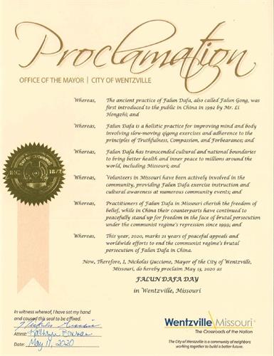现在,鉴此,我,尼古拉斯·古奇昂,温茨维尔市市长,宣布二零二零年五月十三日为密苏里州奥法隆市的法轮大法日。