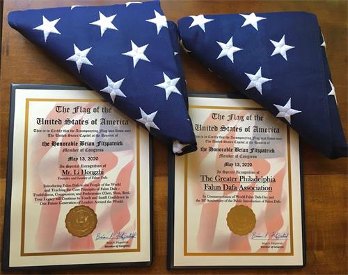 菲茨帕特里克议员在颁发给大费城法轮大法学会的褒奖令中写道,“兹证明,应国会议员布莱恩·菲茨帕特里克(Brian Fitzpatrick)的要求,这面美国国旗于二零二零年五月十三日在美国国会大厦上空飘扬过,以特别表彰大费城法轮大法学会,纪念世界法轮大法日和法轮大法弘传二十八周年。”