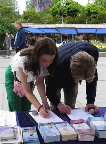 ![]() 图6:五月九日,挪威民众在在一份呼吁挪威国会和政府帮助制止中共活体摘取法轮功学员器官的呼吁书上签名 |