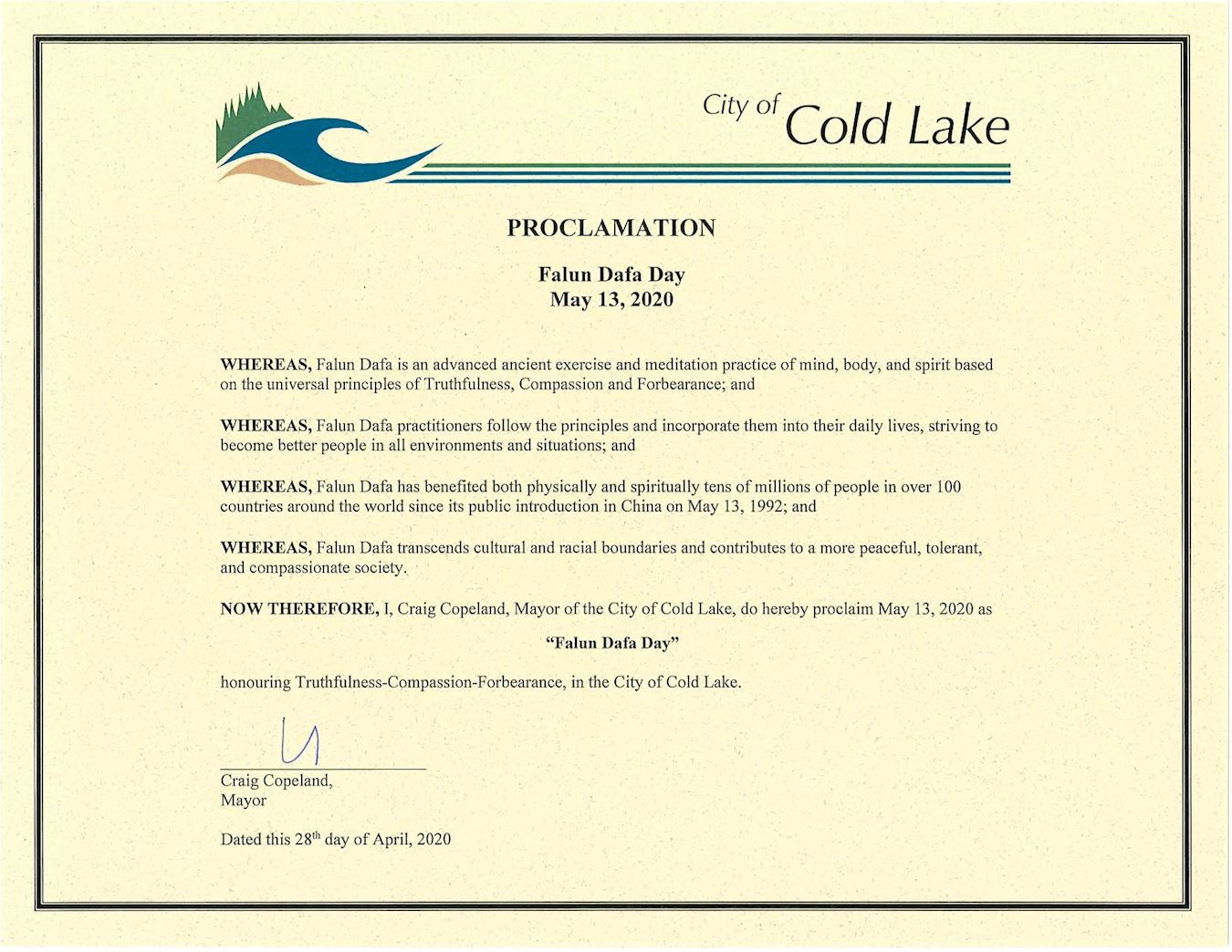 ![]() 图2:冷湖市(City of Cold Lake)宣布2020年5月13日为法轮大法日 |