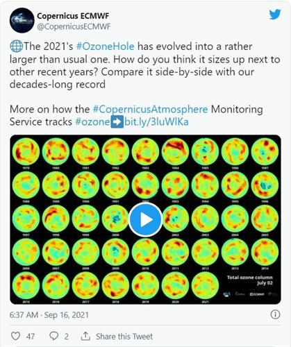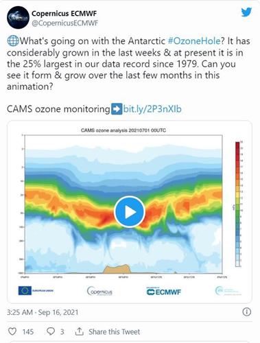 欧盟哥白尼大气监测局(Copernicus Atmosphere Monitoring Service)二零二一年九月十六日发布新闻稿指出,该机构的科学家们发现,九月份以来,臭氧层空洞的面积呈“指数型”地大幅扩大,现在已经比整个南极洲的面积还要大。