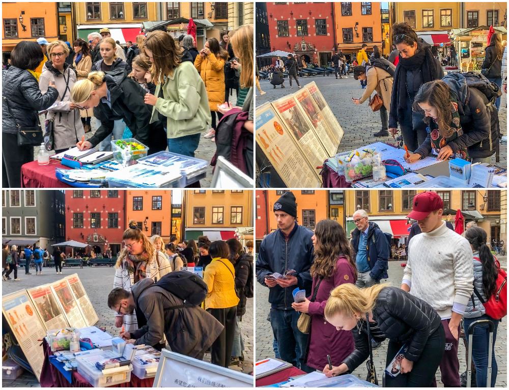 两位来自隆德大学的年轻人一直是蹲在展板前了解真相,他们皱着眉头仔细地阅读,看得出心中有很多的不解。学员看到此景就蹲在他们身旁,从什么是法轮功,到中共惧怕亿万民众信仰真、善、忍,因而栽赃陷害法轮功,残酷迫害法轮功学员、甚至活摘法轮功学员器官的事实真相耐心的一一都做了讲解。两人明白了真相后,感慨地说,“真的是很感谢你,今天让我们知道了这么重要的事情,你们是真的非常的了不起!”两人站起来都签了字,表示发自内心的支持法轮功学员反迫害。