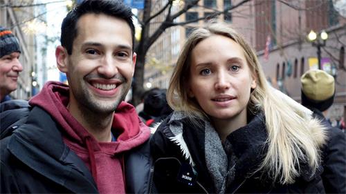 寇迪·南森夫妇(Cody Nathan)第一次在现场观看芝加哥感恩节大游行。寇迪很兴奋地表示,法轮功的游行队伍“真是太漂亮了”。他的太太谢比(Shelby)说:“这是我最喜欢的表演。”