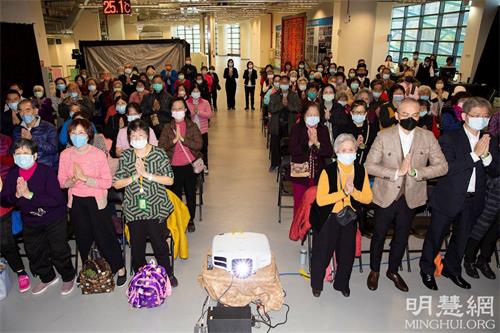 交流会开始前、六千多位来自全台各地的法轮功学员,不论在主厅或台语厅、儿童厅,都全数起立合十,怀着无比感恩的心,向法轮功创始人李洪志先生拜早年,齐声“恭祝师父新年好!”