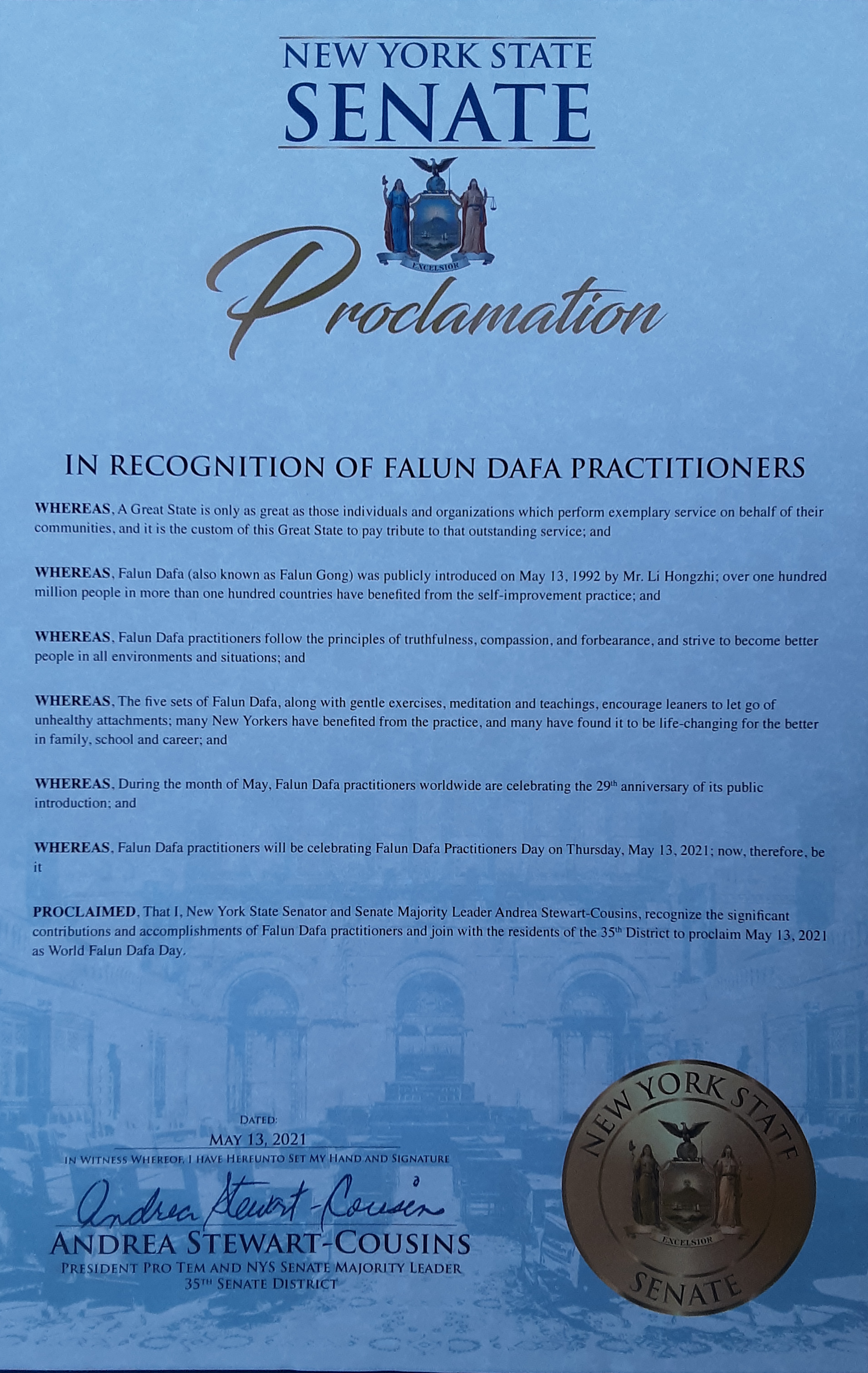 宣告,我,纽约州参议员和参议院多数党领袖安德莱亚·斯图尔特-卡曾斯(Andrea Stewart-Cousins),肯定法轮大法修炼者的重大贡献和成就,并与第三十五区的居民一起宣布二零二一年五月十三日为世界法轮大法日。