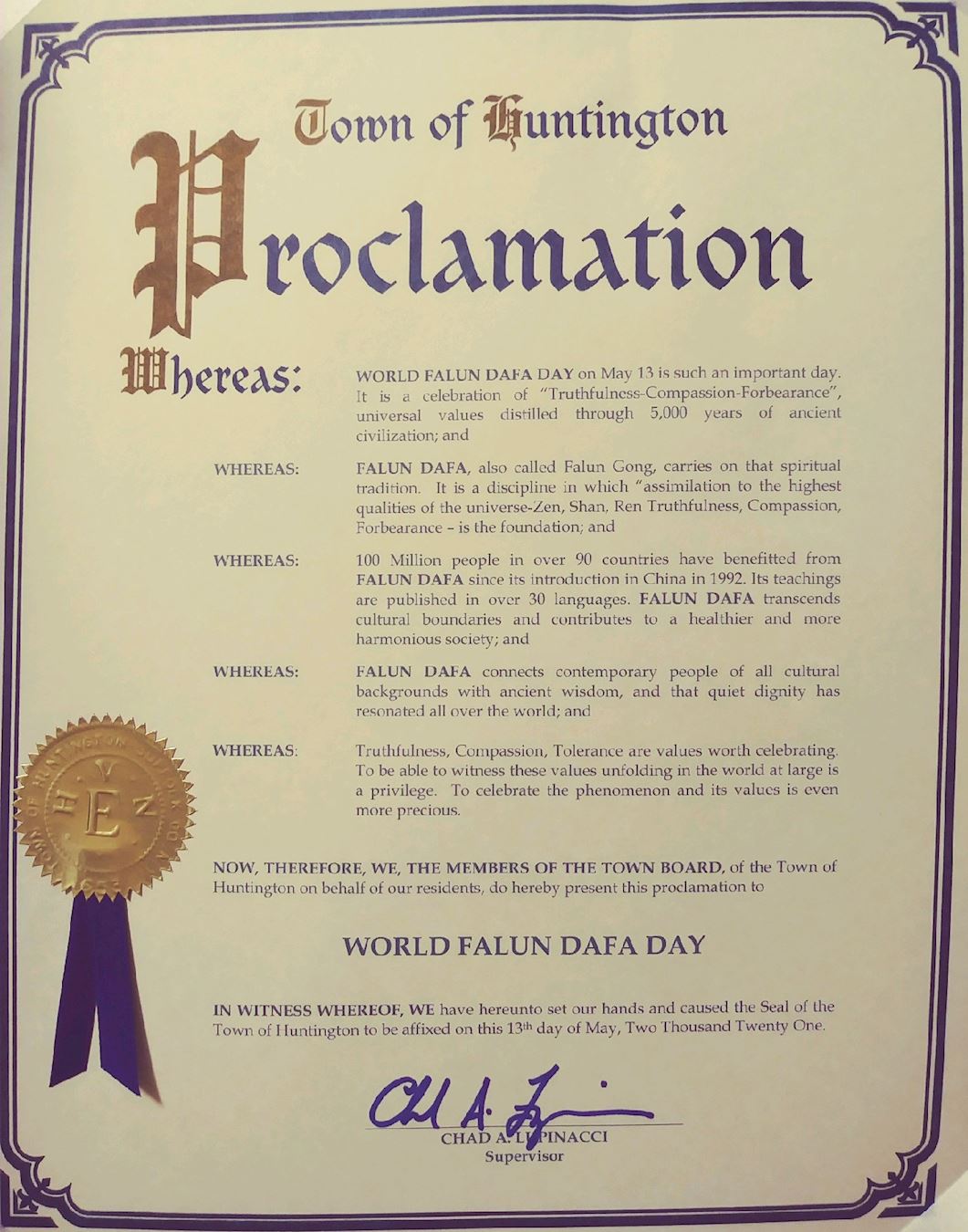 现在,鉴此,我,爱德华·罗曼,布鲁克海文镇的管理者以及镇议会的成员们,代表布鲁克海文的五十万居民以极大的荣幸在二零二一年五月十三日公告今日为:布鲁克海文镇第二十二届世界法轮大法日。