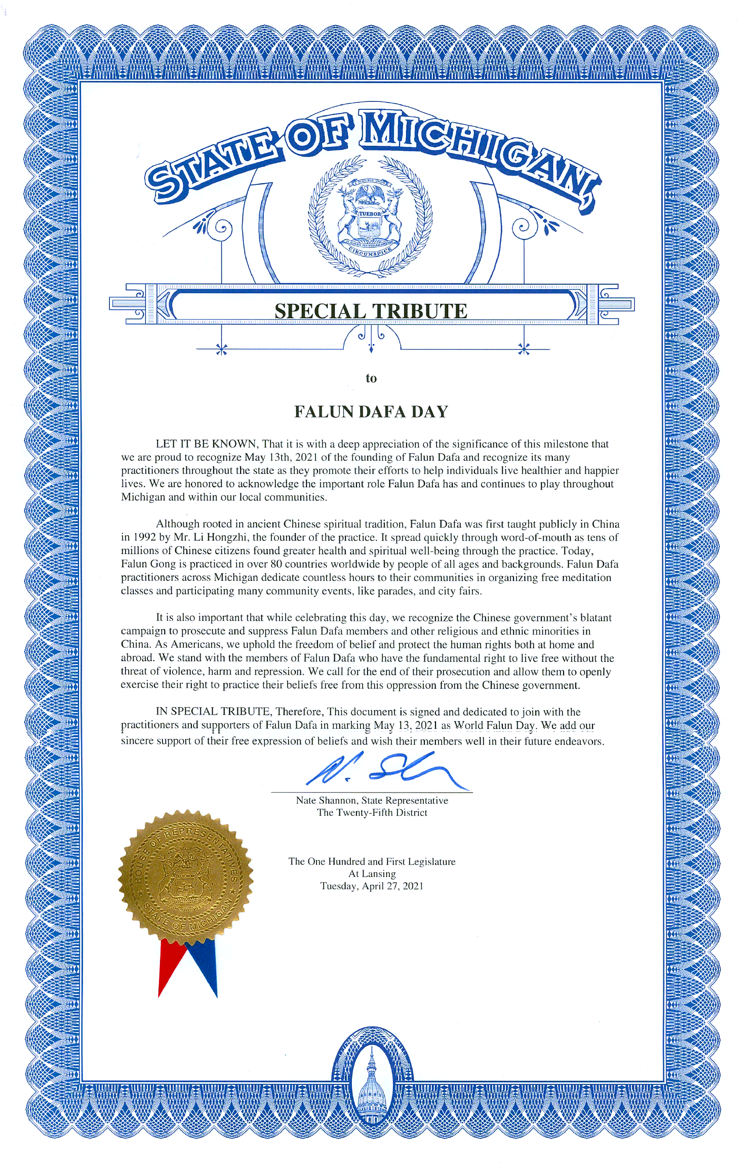 截止到二零二一年五月六日,密西根州法轮大法学会共收到十二位州参、众议员们的六份特殊褒奖令(Special Tribute)和四份贺信。褒奖信中感谢法轮大法给密西根州社区带来的积极影响,以及感谢密西根州的法轮功学员为当地居民的无私奉献。