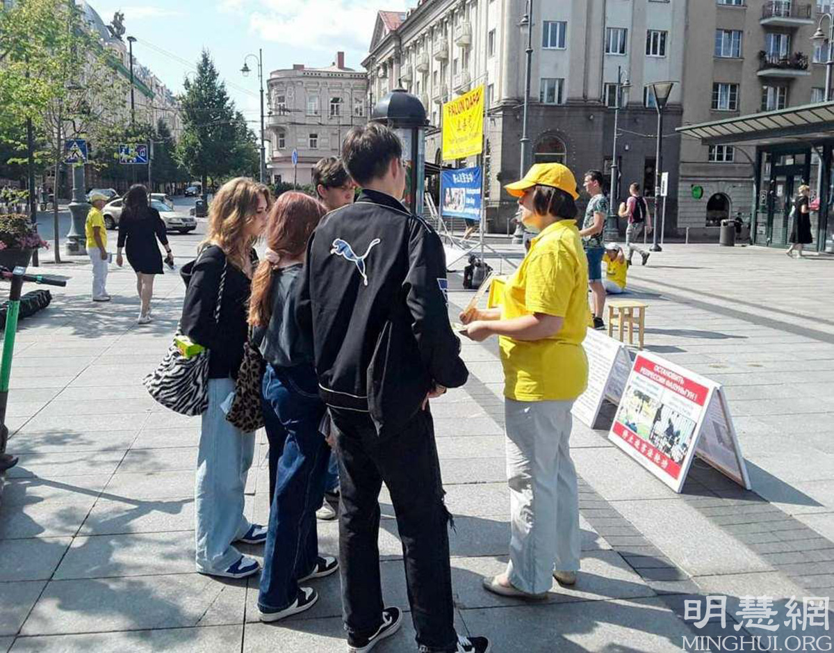 ![]() 图1:法轮功学员在维尔纳市中心文卡斯·库迪尔卡斯广场举办讲真相活动 |