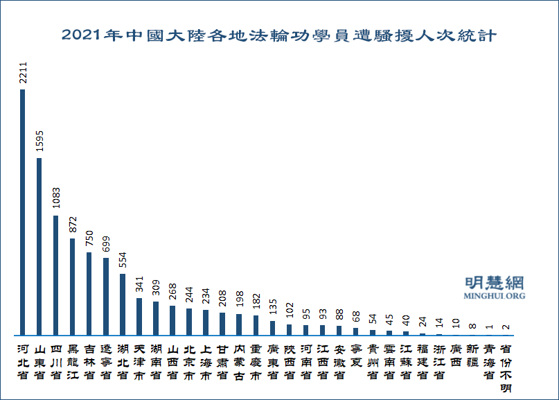 据明慧网报道统计,二零二一年,获知131名法轮功学员被迫害含冤离世,1184人被非法判刑,5886人被绑架,10,527人被骚扰,2747人被抄家,142人被扣发养老金。与二零二零年明慧网曝光的迫害案例相比,二零二一年被非法判刑的人数增长了93%,几乎翻倍,被骚扰的人次也由二零二零年的8576增加到二零二一年的10,527人,即增加了23%。