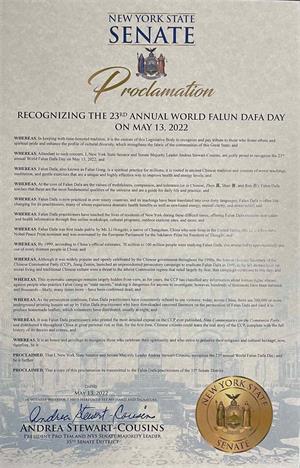 纽约州第三十五选区州参议员多数党领袖安德烈埃·斯图尔特-考辛斯(Andrea Stewart-Cousins)在褒奖中说:一九九年中共总书记江泽民发起的对法轮功的迫害前所未见,他们企图在当年彻底清除法轮功,因为法轮功遵循的生活道德和传统中国文化是中共无神论政权的严重威胁。当年的迫害持续到今天。