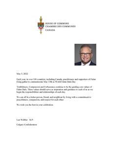 卡尔加里信号山选区国会议员利伯特(Ron Liepert)赞赏法轮大法的原则,“五月十三日是法轮大法传世的日子。尽管遭受迫害,法轮大法修炼者依然遵循真、善、忍的原则。在疫情中,这些原则尤为重要。在加拿大,法轮大法学会努力打造一个充满活力的社区。他们的努力在加拿大受到褒奖,因为加拿大人有幸充分享有坦诚、多元和信仰自由的价值观。”