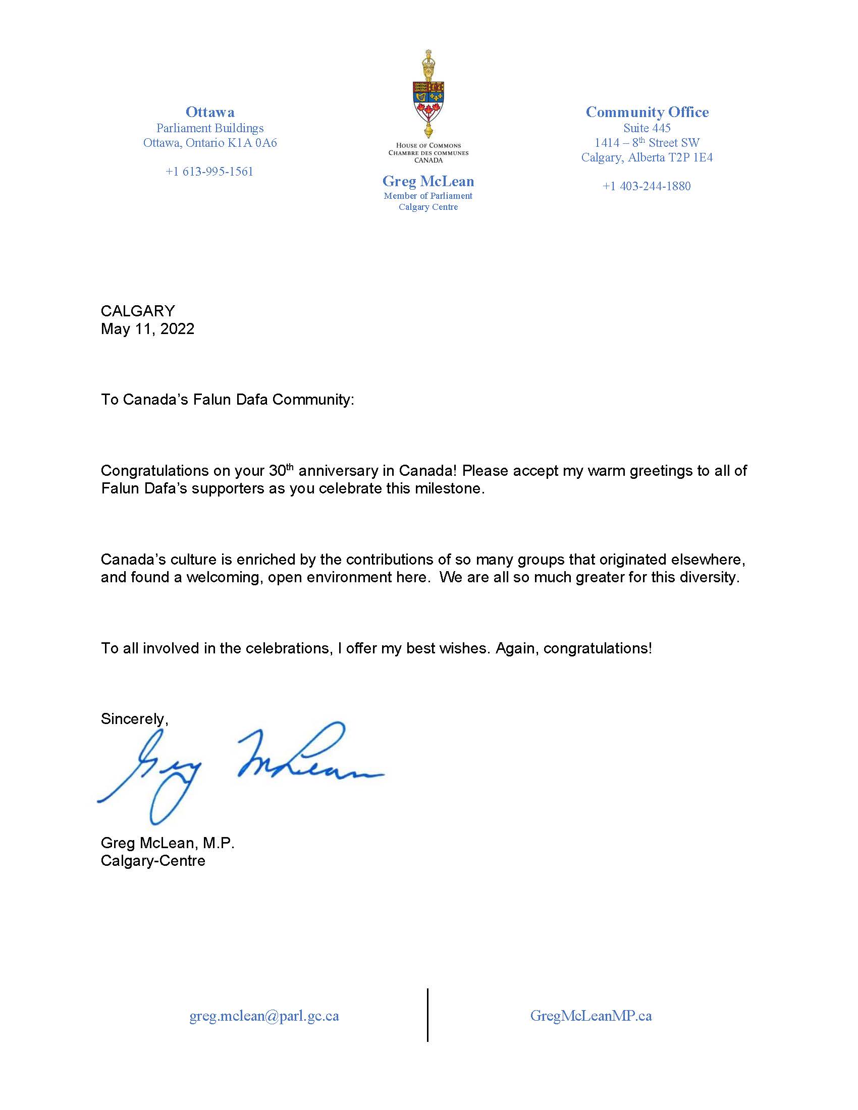 卡尔加里中心选区国会议员麦克莱恩(Greg McLean)献上了热忱的问候,“祝贺法轮大法传世30周年。法轮大法的支持者们,请接受我热诚的问候。向参加庆典的所有人,致以我最美好的祝福。祝贺!”