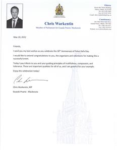 Grande Prairie-Mackenzie国会议员沃肯廷(Chris Warkentin)向法轮大法修炼者“致以最美好的祝愿”,并敬佩地表示,“我向你们和你们所遵循的真、善、忍致敬。对我们所有人而言,这些都是重要的品质,我非常感谢你们的以身作则。法轮大法团体也有力地提醒着我们,不能视自由为理所当然而不加珍惜。”