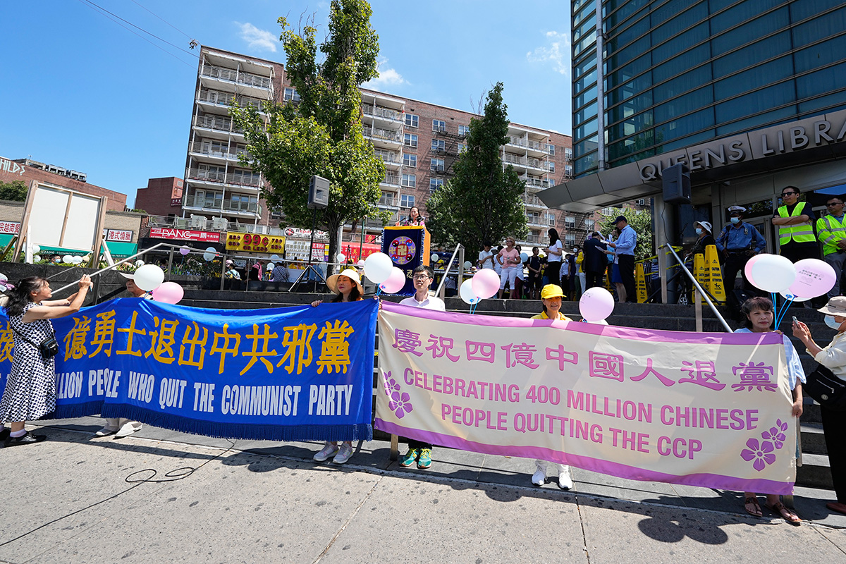 当日,法拉盛街头,车水马龙。图书馆前锣鼓喧天,人头攒动。退党义工、社会正义人士、社区领袖、现场公开退党人士等数百人参加了集会和庆祝活动,众多路人观看集会并表达声援。现场巨型横幅“声援4亿勇士退出中共邪党”,“庆祝4亿中国人退出中共”等横幅特别醒目。