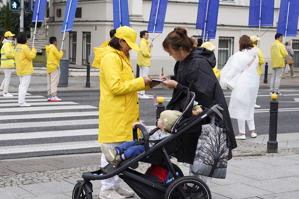 绘图师乔兰塔(Jolanta)看见了法轮功的游行。三天前的晚上,她曾在中共大使馆前看到法轮功学员举办的烛光悼念活动,她得到了一张传单,她说自己知道在中国发生了很多迫害民众的事情,但不知道更多的信息。