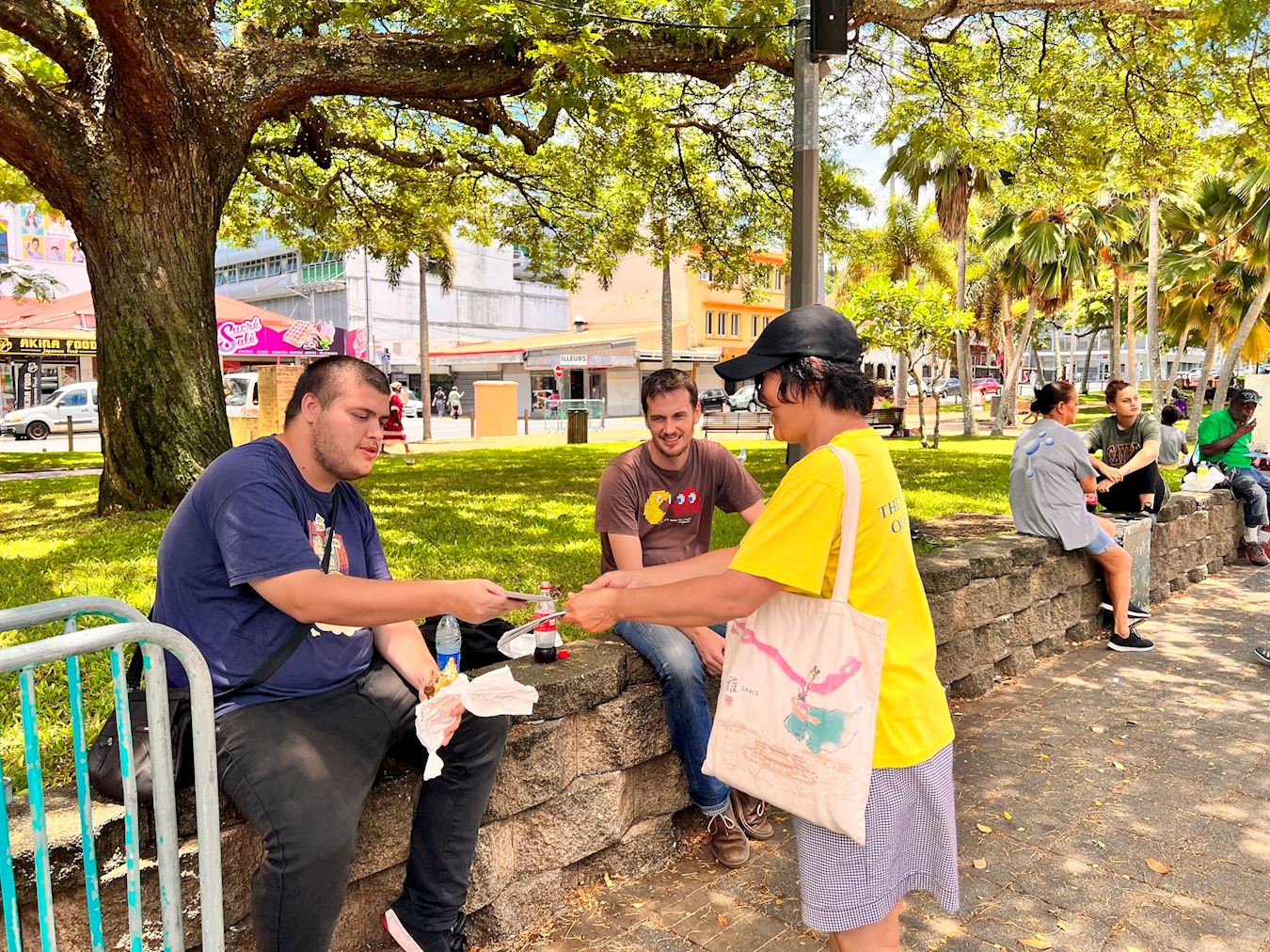 十二月的新喀里多尼亚,地表温度高达三十八度,时阴时雨,有时又阳光炙烤、天气炎热。法轮功学员们在购物中心发单张、派发信箱、在政府部门以及媒体讲真相,并且在市中心公园和一家幼儿园教功,让许多人了解了法轮功。当地一家电台向大家介绍了法轮大法,并鼓励他们去教功点学炼。新喀里多尼亚人民都非常友好、善良,他们认同真、善、忍理念,感恩有机会学习法轮大法。