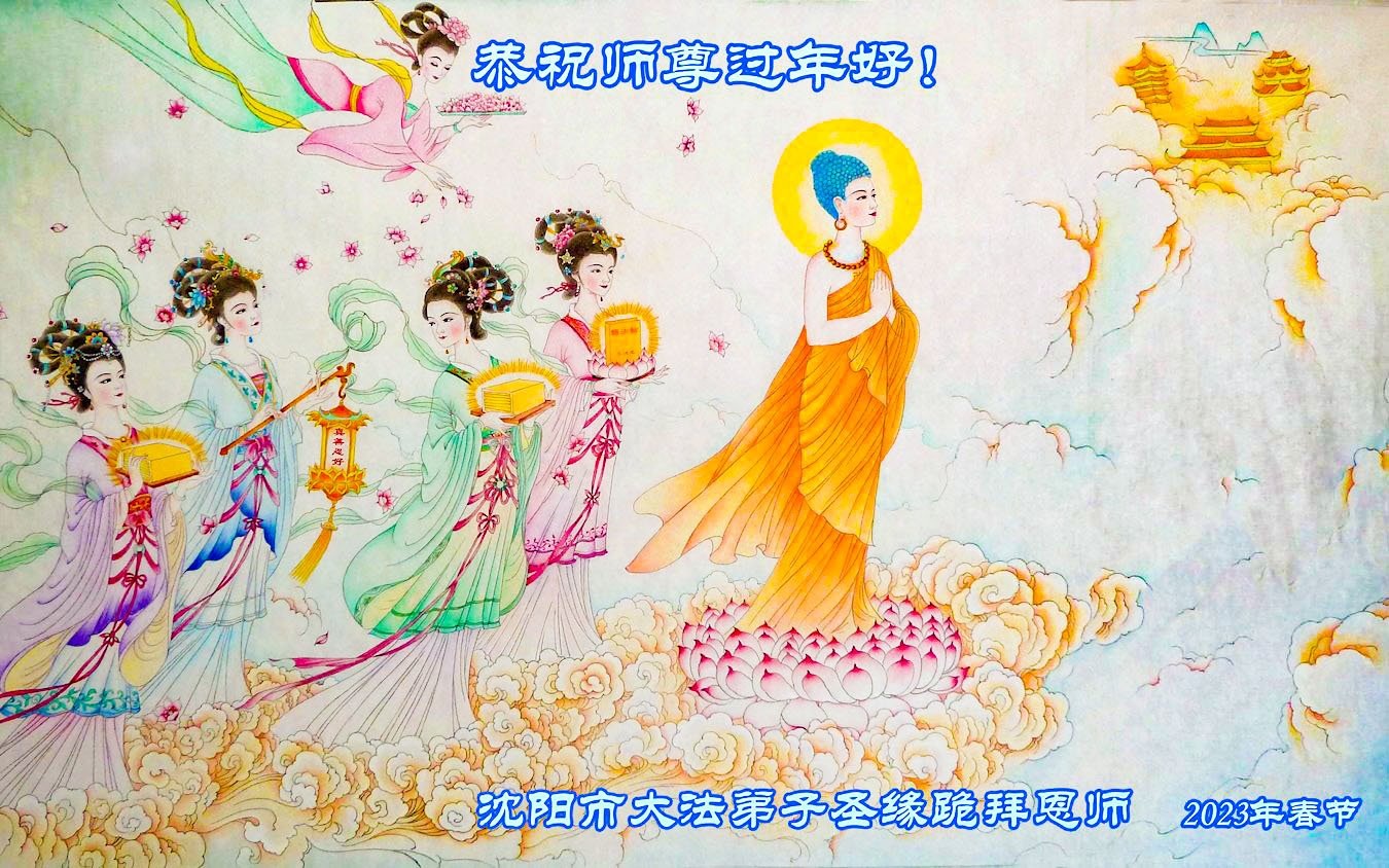 在这新年来临之际,弟子拜谢慈悲伟大的师父!师父新年好!师父新年快乐!弟子修炼十多年来受益良多,弟子没有珍贵的礼物敬献师尊,弟子只有感恩的心,谢谢师尊!弟子感恩师尊的慈悲苦度!慈悲的师尊您辛苦了!您的浩荡佛恩弟子无力报答,弟子要听您的话,走好您安排的路,做好三件事,要更加精進,圆满随师还。