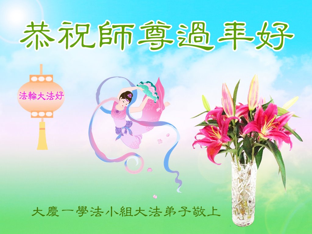 重庆市潼南区一大法弟子在贺词中表示:弟子八十一岁了。当年病魔把我拖到生命边沿时,恩师把我从地狱里捞起,传给了我宇宙大法,使我明白了人生的意义和真正目地,给了我一个健康的身体。我家四代同堂,儿孙们都相信法轮大法好!