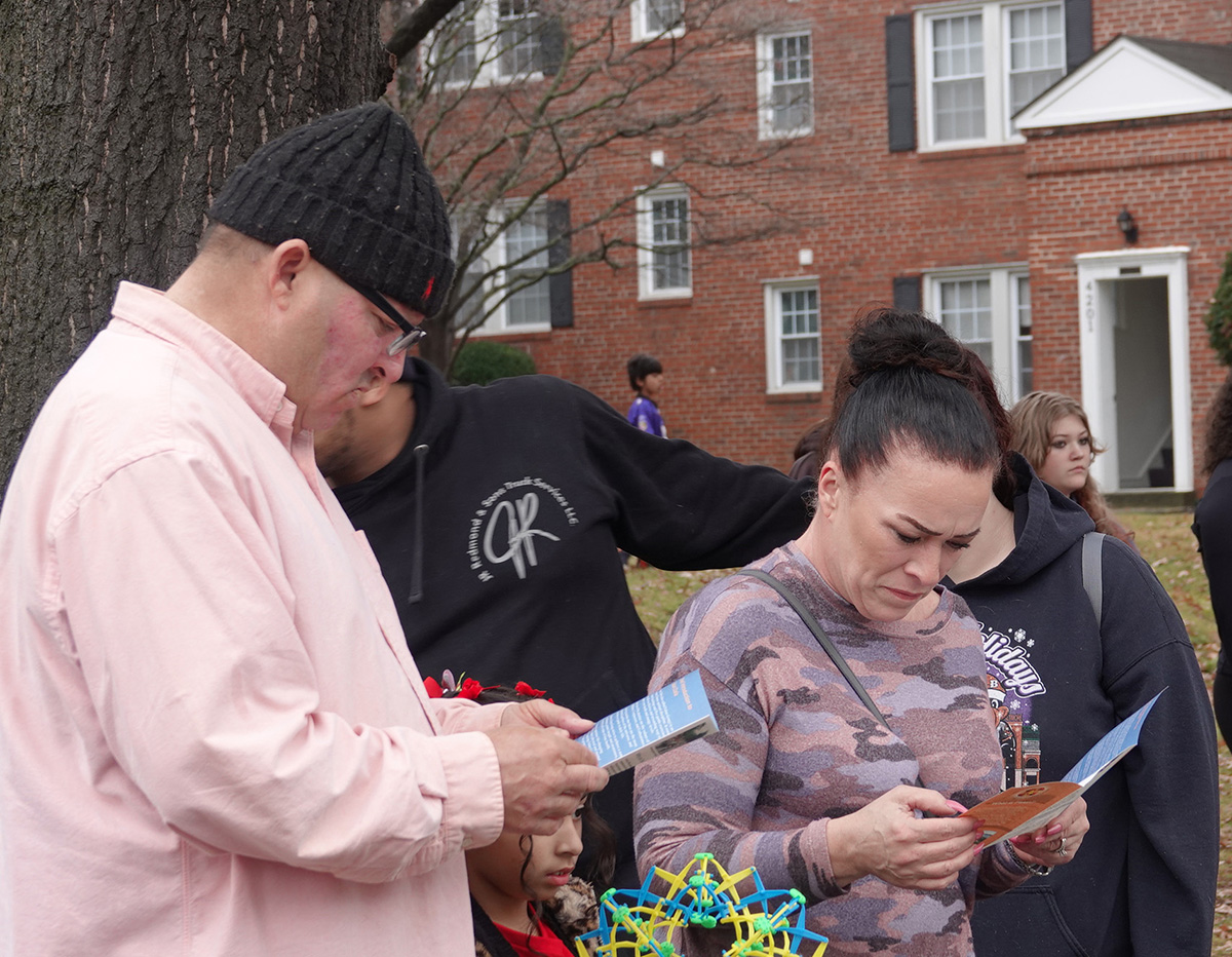 凯莉(Kellie)和先生各自拿到一份法轮功真相传单,他们仔细阅读传单的内容。凯莉说,她刚刚被诊断出患有高血压,她想尝试打坐。看到花车上法轮功学员演示功法,她对法轮功功法很感兴趣,仔细查看传单上的法轮大法网站信息。
