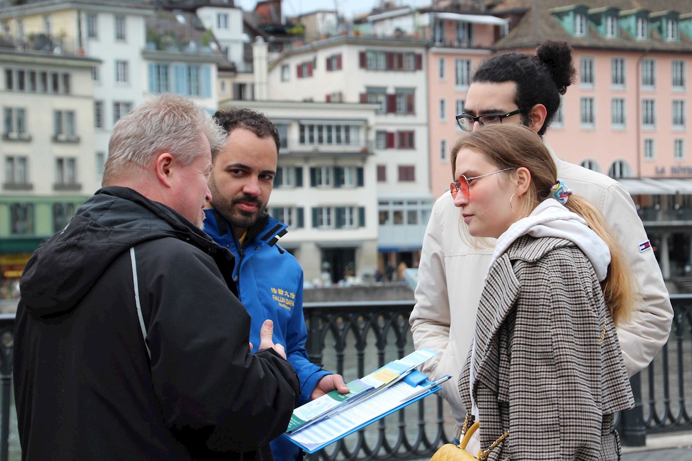 在过去的多年里,法轮功学员都会在利马特河畔向路人及游客讲述法轮功真相。这里是瑞士最大城市苏黎世老城及时尚的交汇点,也是著名的苏黎世大教堂(Grossmuenster)和圣母大教堂(Fraumuenster)的中间,因此来往的路人中有很多来自世界各地的游客。