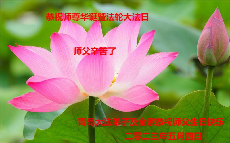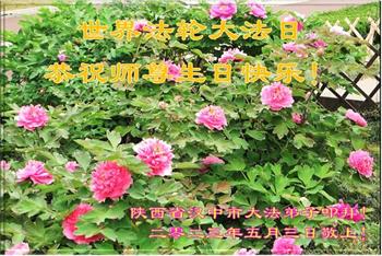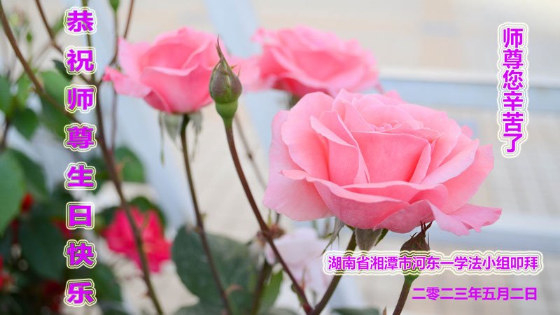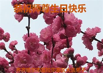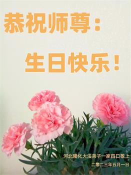 尊敬的李大师好!我是大法弟子的家人。明媚的五月,春风送暖,百花盛开,姹紫嫣红,春意盎然,喜逢大师华诞,诚心恭贺李大师生日快乐!大师新年发表的《为什么会有人类》的文章,我拜读了,并且听了好多遍。这是大师赐予人类的宝物,深感大师佛恩浩荡!感谢大师的慈悲救度!我也要做一个正直、善良、知感恩的好人。我天天诚心敬念”法轮大法好、真善忍好”九字真言。有大师的护佑,我们都是幸运的,个个幸福安康。
