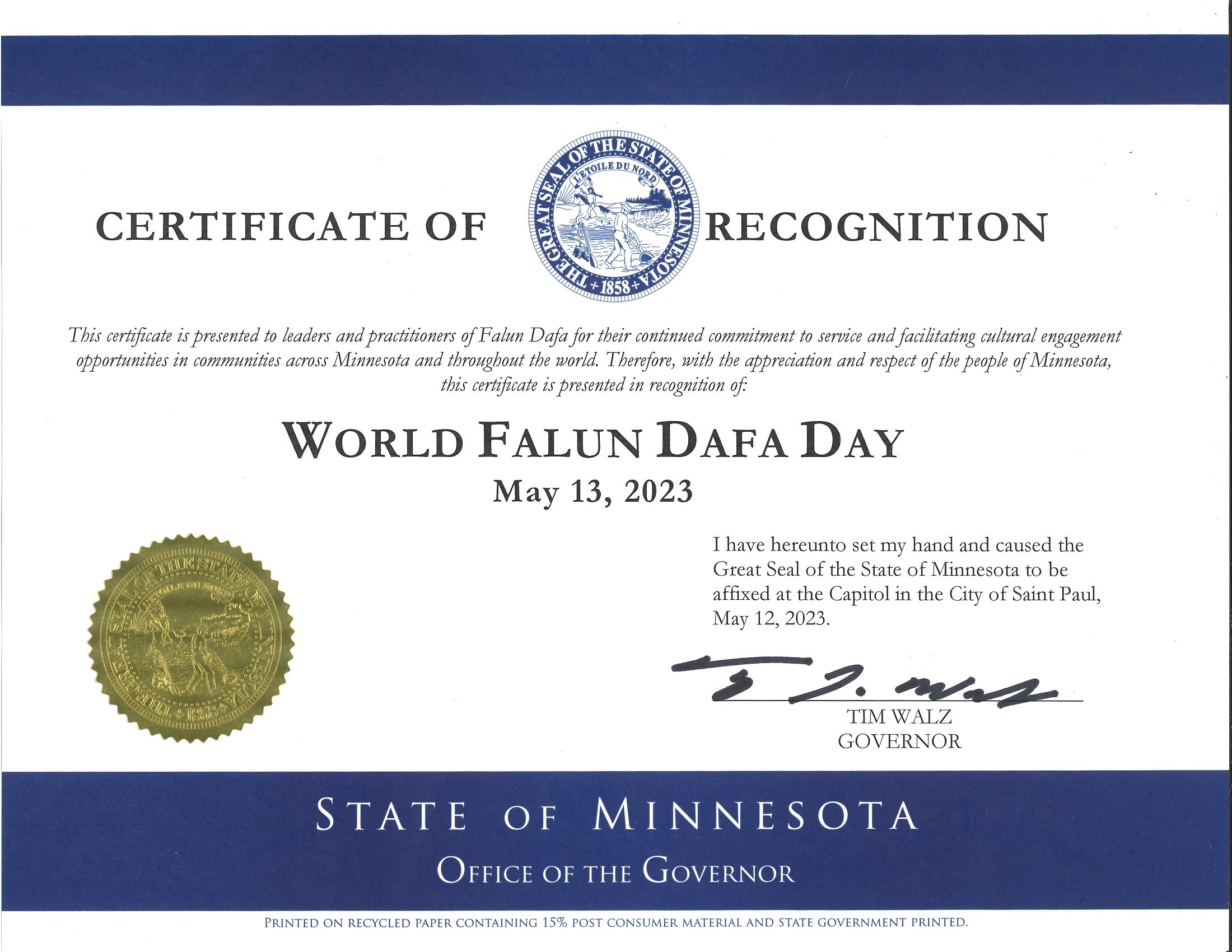 该证书颁发给法轮大法的创始人及修炼者们,以表彰他们继续致力于为明尼苏达州乃至世界各地的社区提供服务并促进文化交流的机会。因为他们受到明尼苏达州人民的感激与尊重,特颁发此证书以表彰:二零二三年五月十三日世界法轮大法日