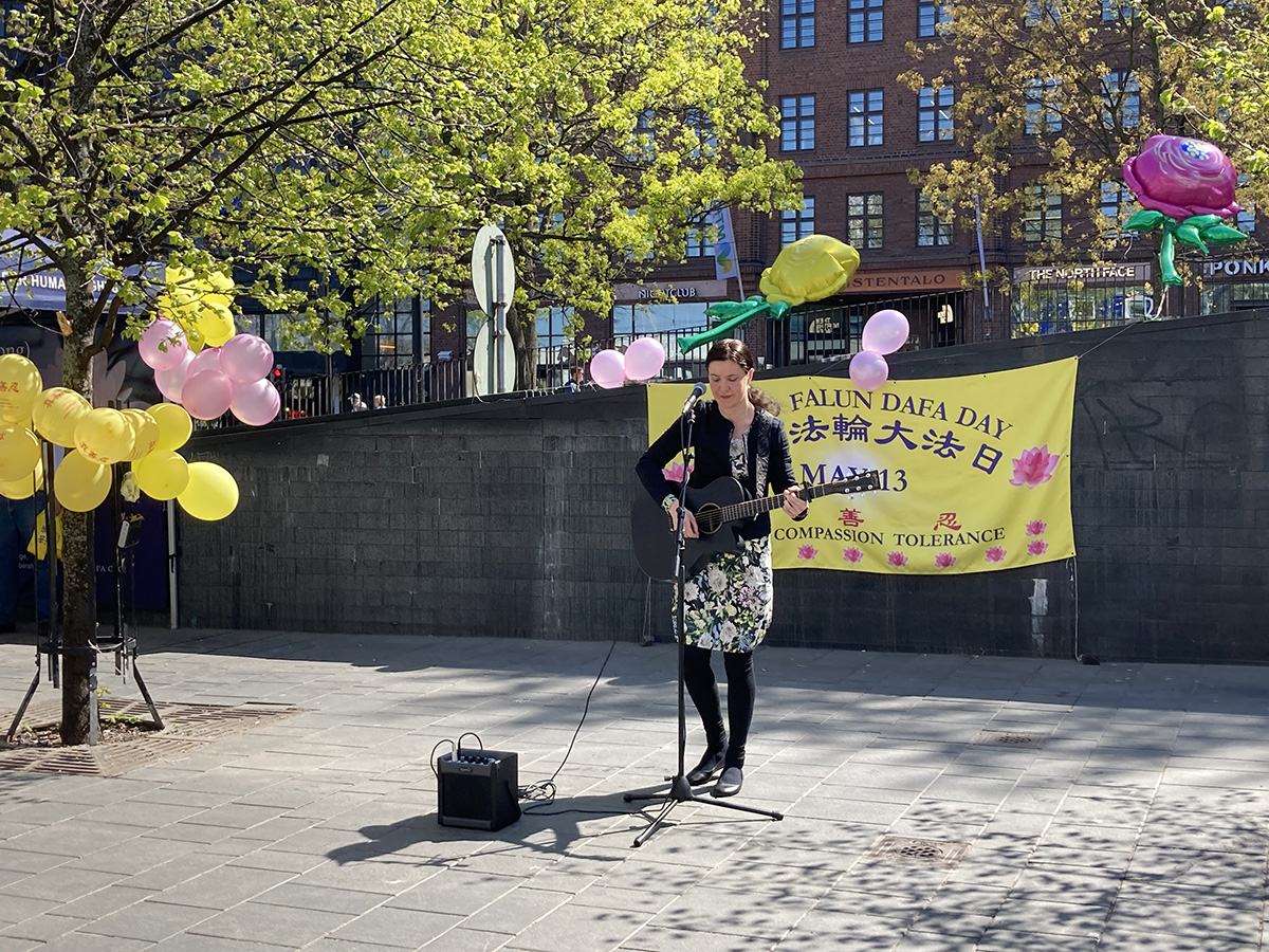活动现场在黄色气球的点缀下格外醒目,学员们以吉他表演,葫芦丝演奏,歌唱表演,集体炼功等方式与民众分享修炼法轮大法后,让人身心健康、道德回升后的喜悦。路过的行人或点头微笑致意或向学员竖起大拇指。很多人接过传单,了解到中共仍持续的迫害后,签名支持法轮功坚持不懈的努力。