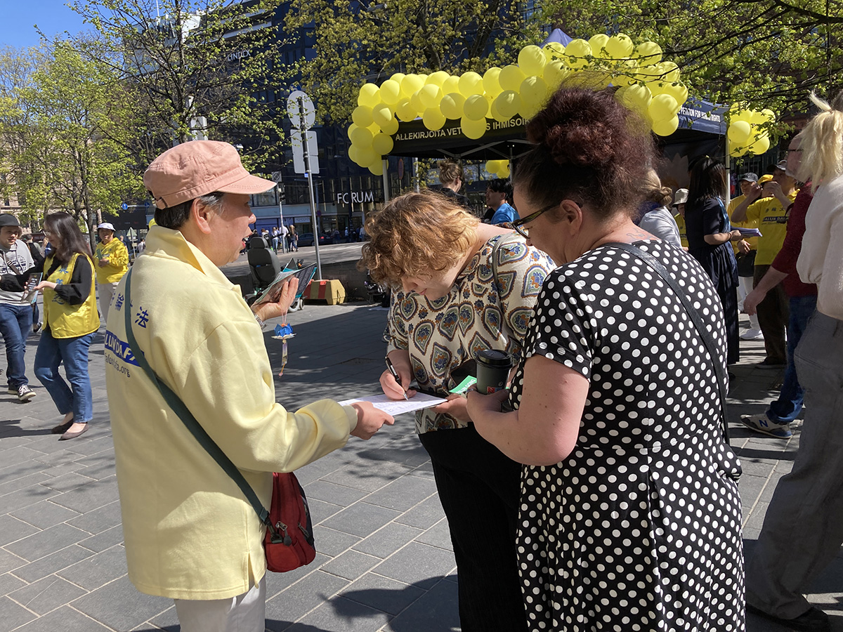 迈克尔(Michael)是赫尔辛基的学生,因为他母亲曾学炼法轮大法,所以对法轮功遭遇非常了解。他的伙伴艾玛(Emma)也停下来观看庆祝法轮大法日的表演。听到中国修炼者的故事后,她对中国的问题感到非常难过,并祝愿学员们有一个美好的下午。
