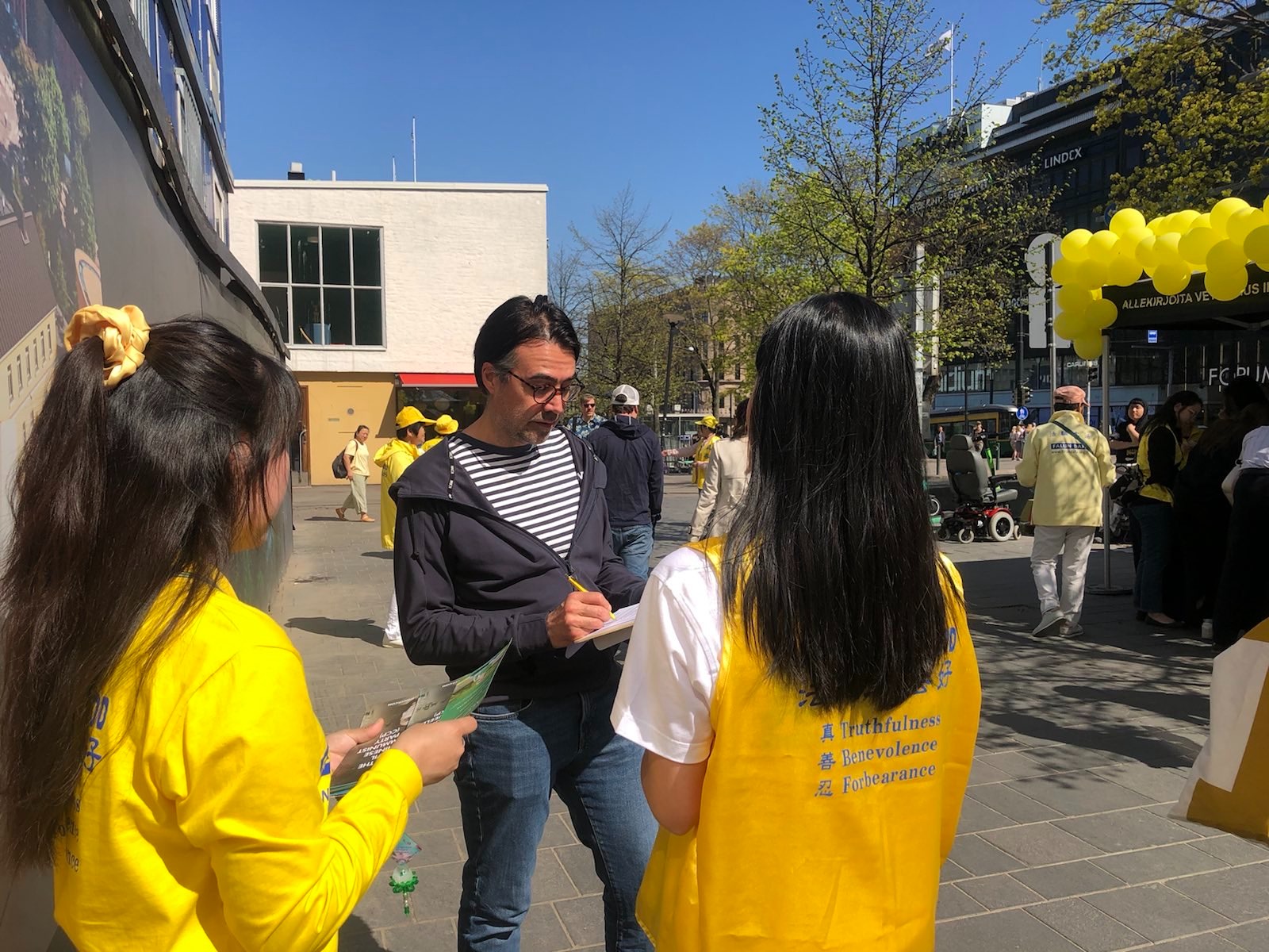 来自印度的奇拉斯(Chiras)听到法轮大法的介绍后,立即询问赫尔辛基的炼功点。他说他的妻子对打坐非常感兴趣,他自己也想试着读一下法轮功著作《转法轮》这本书。他表示:“迫害不应该发生,每个人都应该享有人权,就像芬兰这样。”