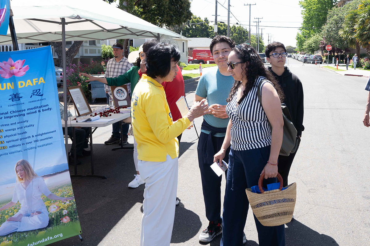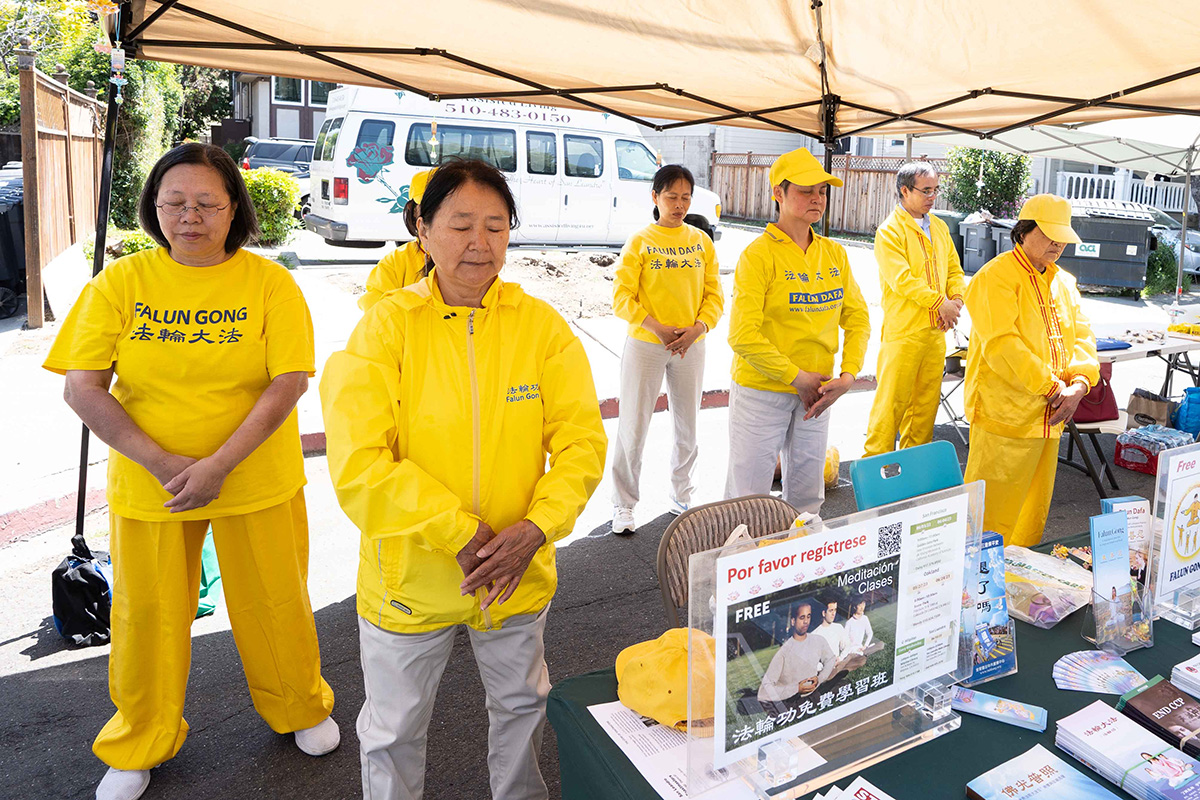 几个月前学过法轮功的埃迪·昆特罗(Eddie Quintero)在法轮功学员的展位跟学员学动作,“很高兴法轮功学员帮我纠正动作,我学功后感觉很好,感到内心的平静。之前我容易生气,现在我学会更好的控制自己。”