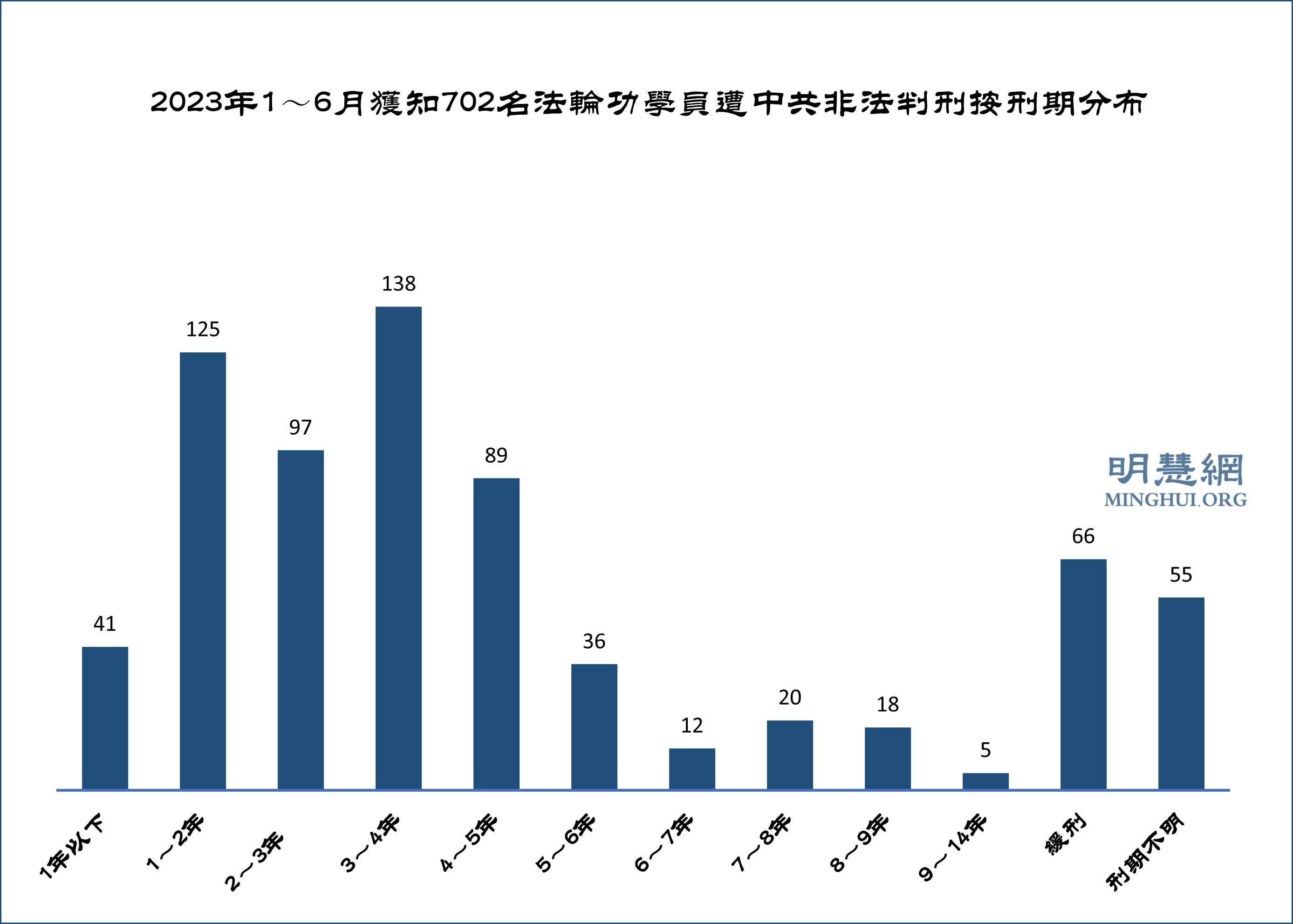 ![]() 图1:2023年1~6月获知中国各地法轮功学员702人被非法判刑 |