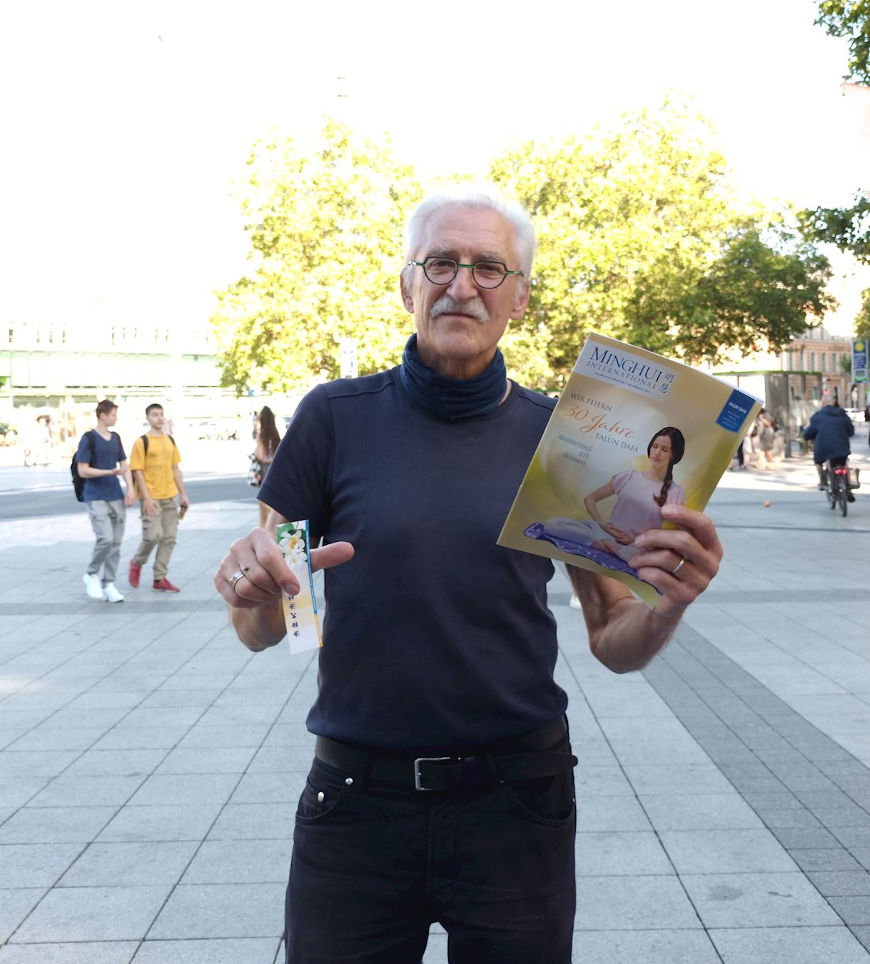 说到大法真、善、忍的准则,他说:“这完全符合我的观点。”他还表示,学员们的活动让人感动。