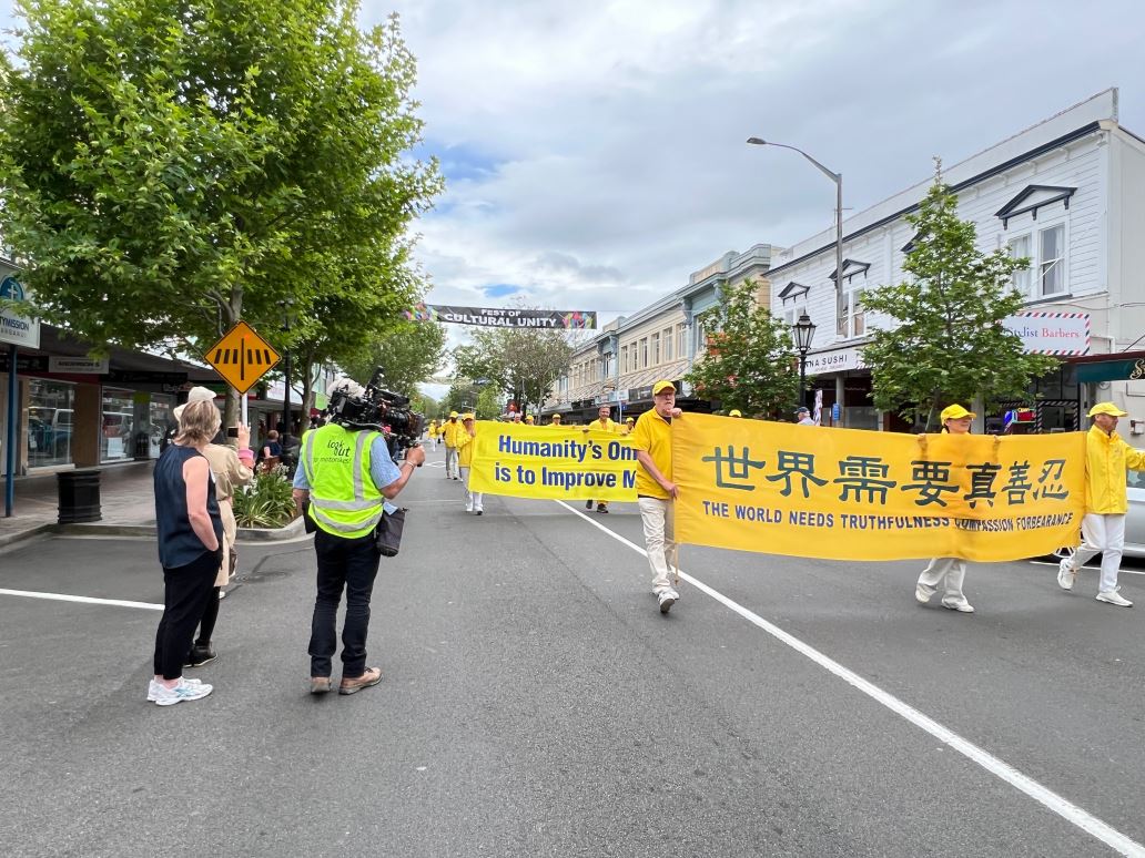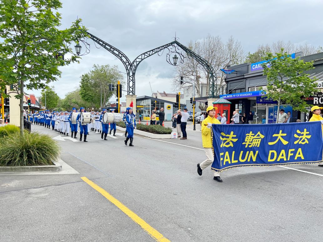 当天下午一点,由旺加努伊老爷车队的带领下,游行队伍正式出发,而街道两旁的人们已经翘首期盼。由法轮功学员组成的天国乐团、腰鼓队、仙女队出现时,顿时让人们眼前一亮。“法轮大法好”、“世界需要真善忍”的信息,让他们感动。有的观众赞叹法轮功学员用如此美好的方式,传递了这么重要的传统价值观。
