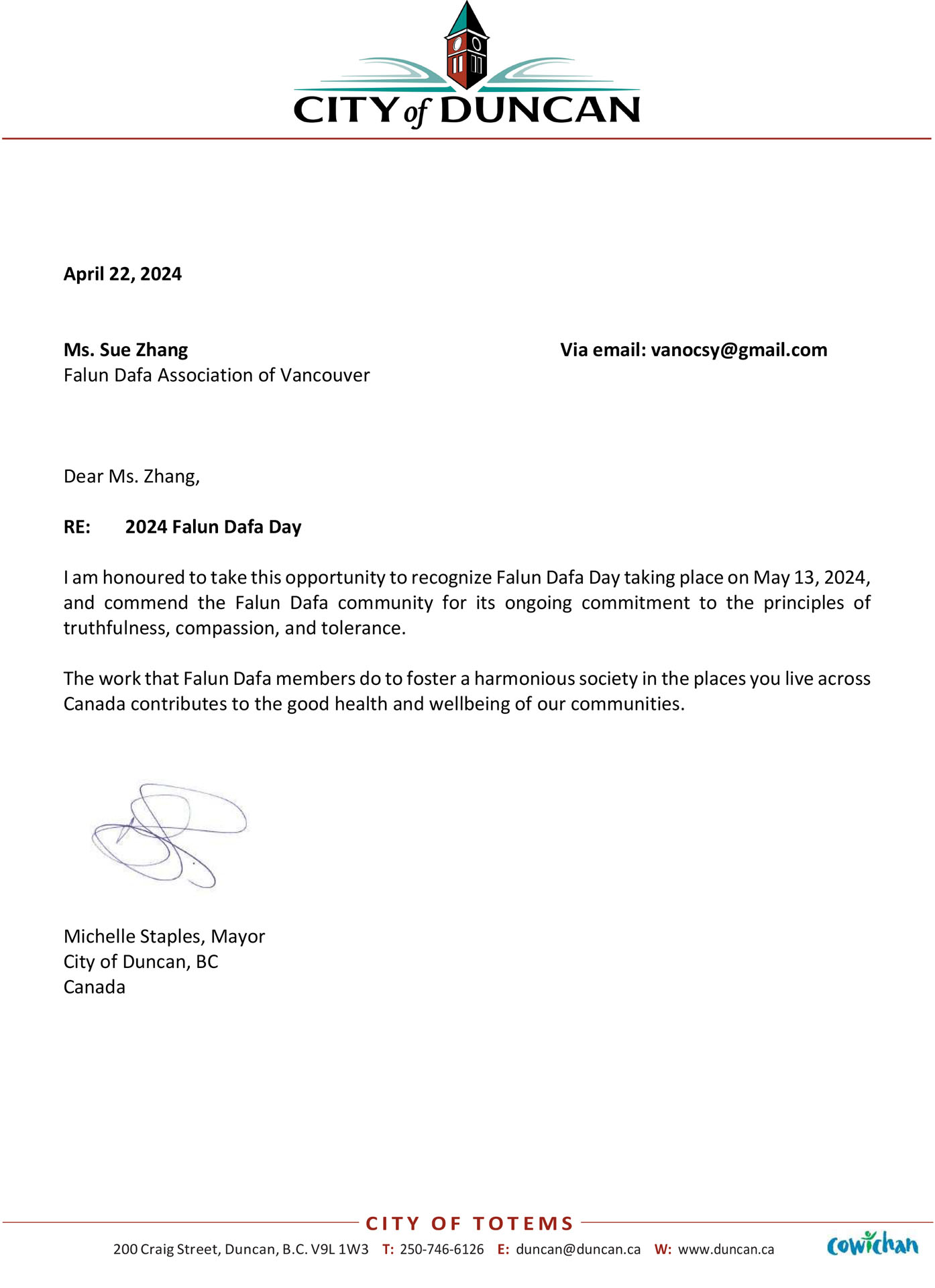 邓肯市市长米歇尔·斯台普斯(Michelle Staples)发来的贺信中说:“我很荣幸借此机会表彰二零二四年五月十三日的法轮大法日,并赞赏法轮大法社区对“真、善、忍”原则坚持不懈的追求与奉献。