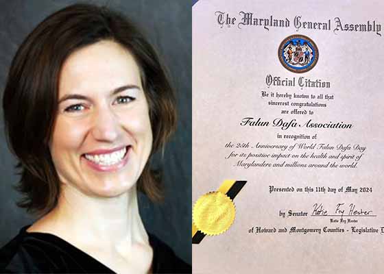 在第二十五届世界法轮大法日以及法轮大法弘传世界三十二周年来临之际,美国马里兰州参议员凯蒂·弗莱·赫斯特向法轮大法学会颁发褒奖证书