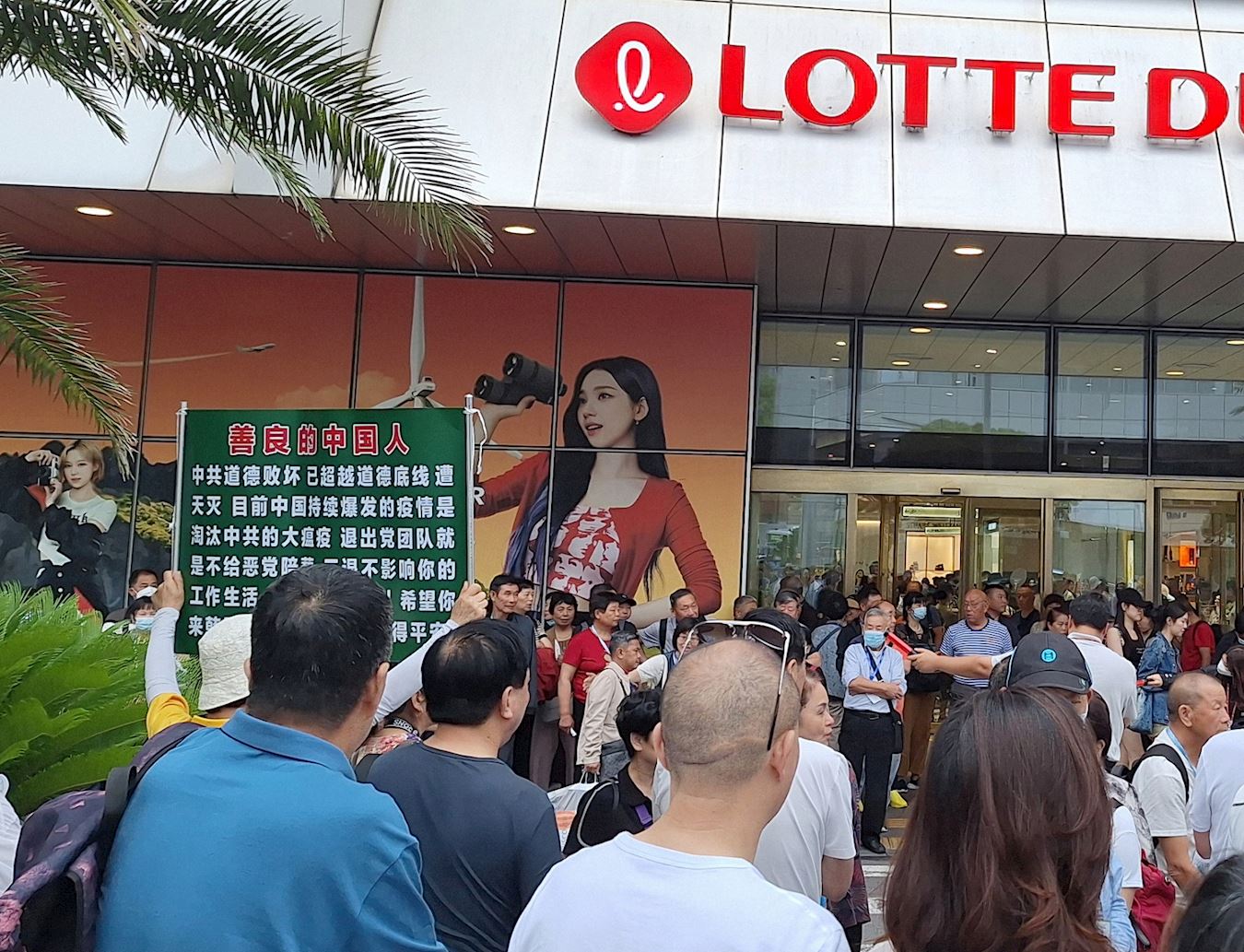 ![]() 图1~2:在乐天免税店前,中国游客们驻足阅读法轮功真相展板。 |