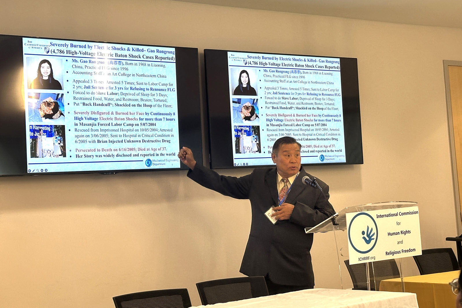 图1:二零二五年十月十日和十一日,国际人权与宗教自由委员会在美国弗吉尼亚州洛顿举办了为期两天的年会。美国天主教大学工程学荣誉退休教授聂森博士在会上讲述了在中国持续发生的中共对法轮功学员的迫害。