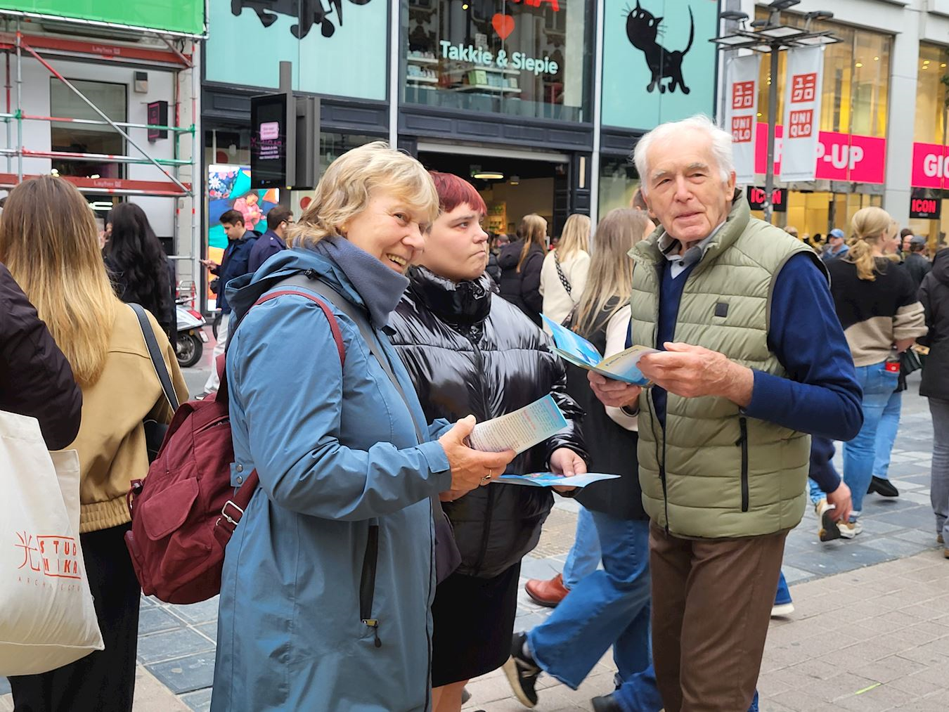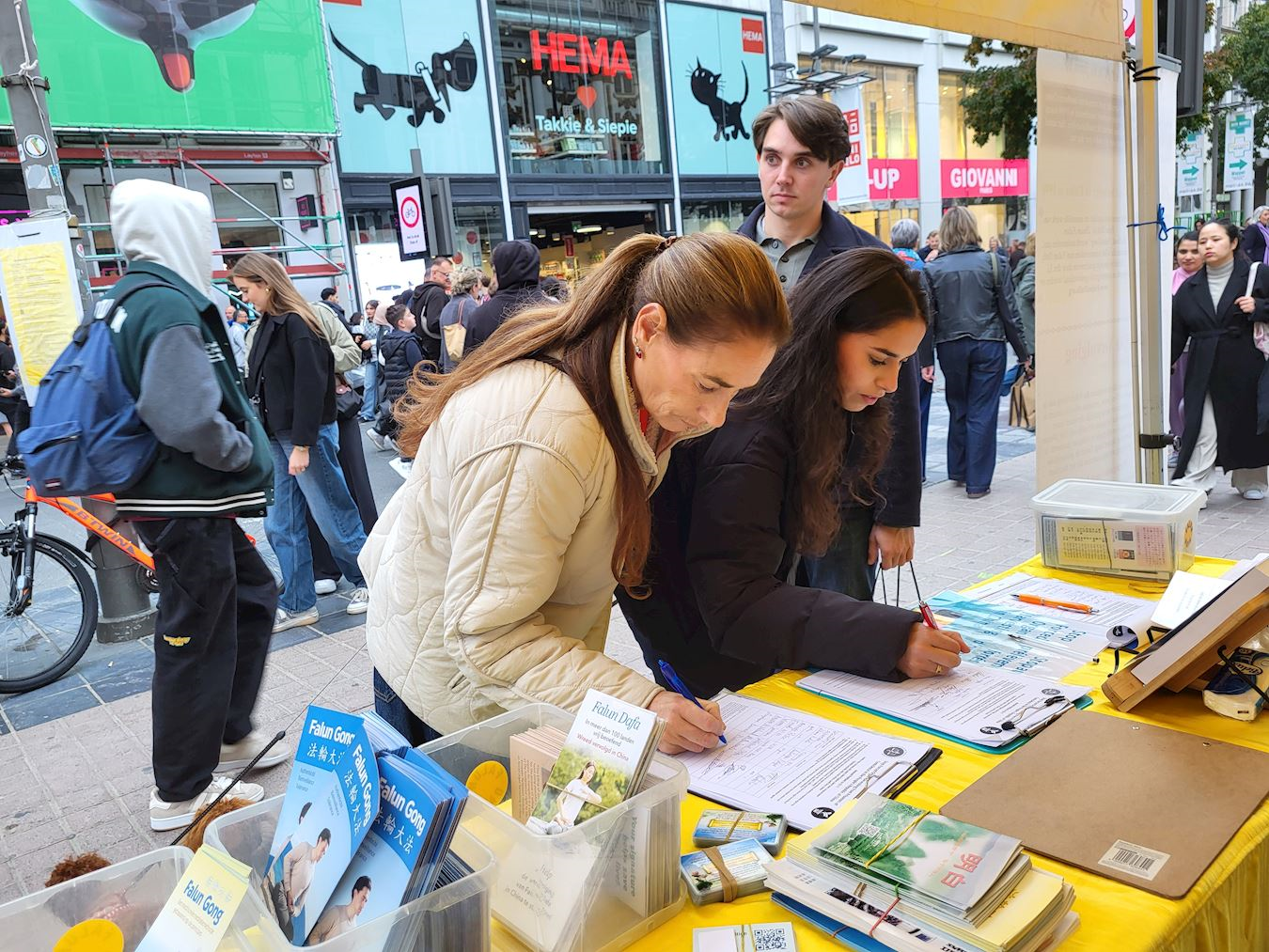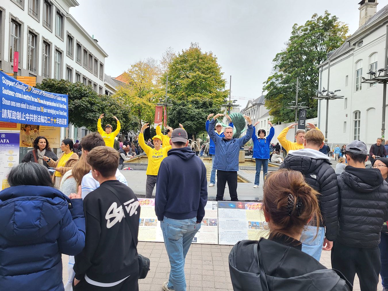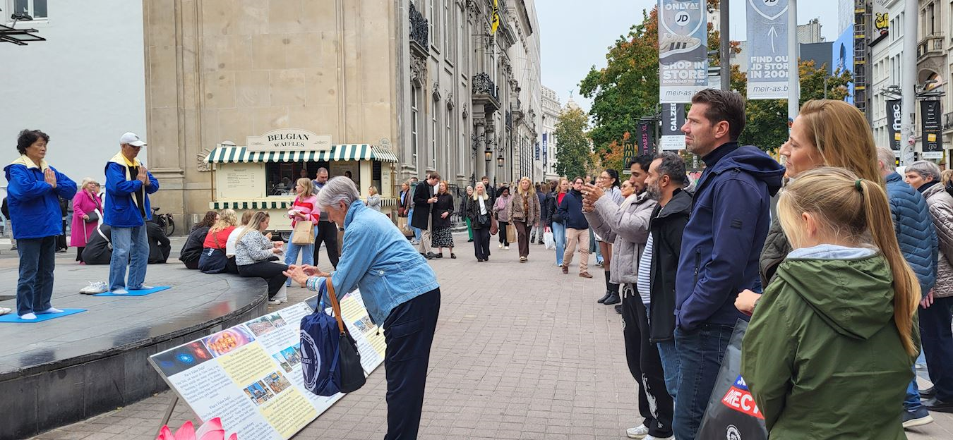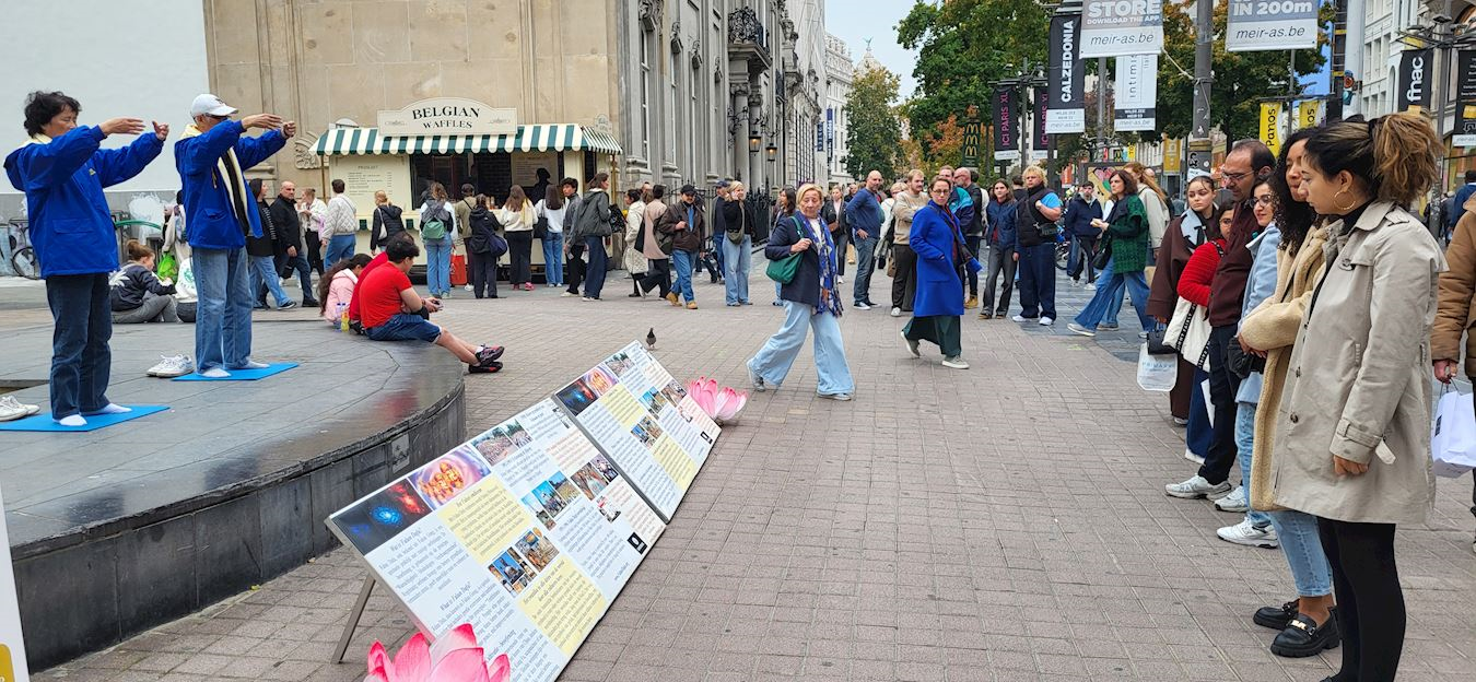 【明慧网二零二五年十月十四日】(明慧记者唐容比利时报道)二零二五年十月十一日金秋季节,著名的安特卫普梅尔(Meir)商业步行街上人头攒动,法轮功学员再一次走上街头,向人们介绍法轮大法(又称法轮功),及在中国遭受的迫害。人们被学员整齐优雅的功法所吸引,驻足观看并赞叹,进而了解法轮功,并纷纷支持反迫害。